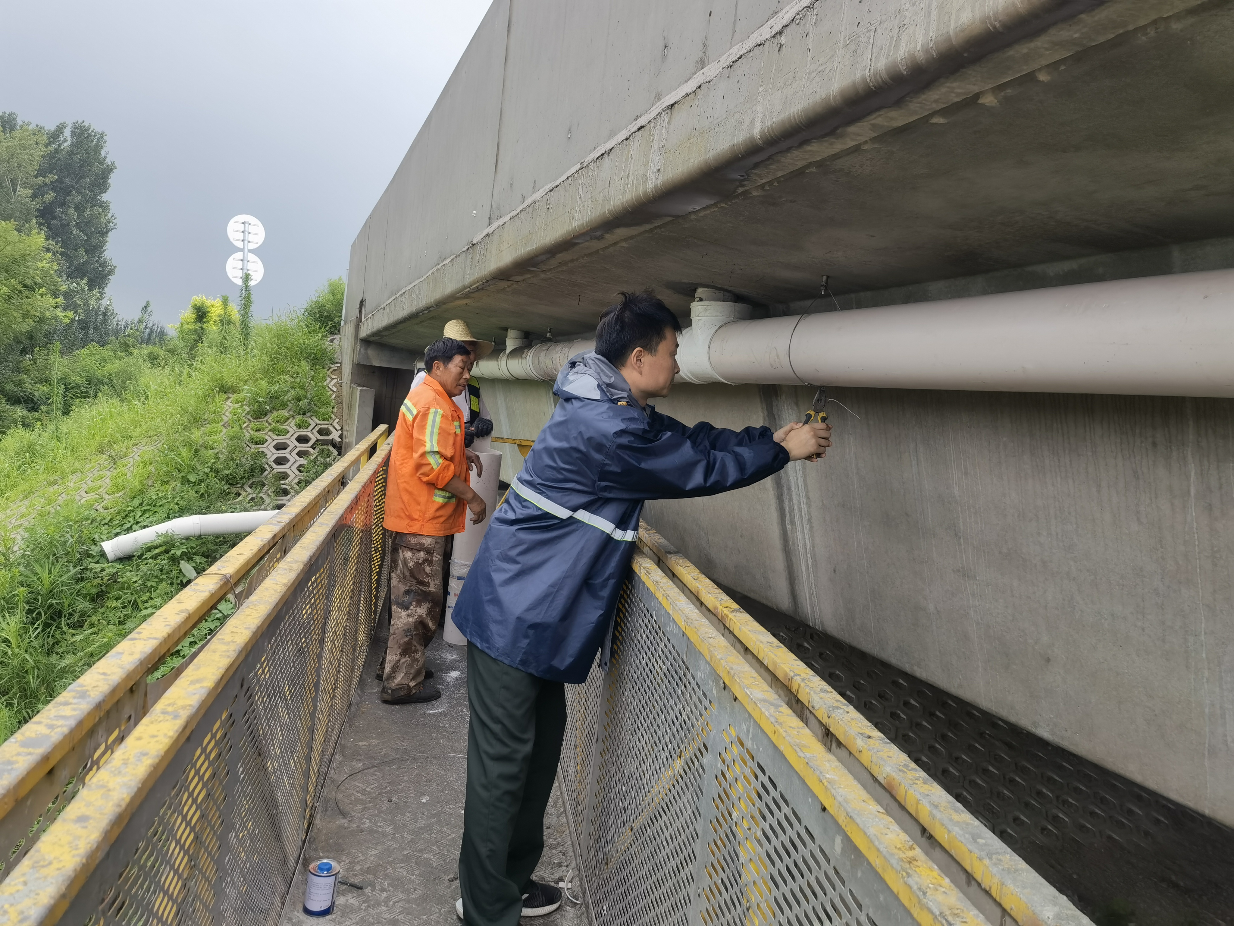 7月13日上午,在雨后的例行巡查中,东新庄养护工区巡查员发现在K135+111东门庄1号桥上有几根横向排水管存在老化脱落的迹象,如果不及时进行更换存在排水管掉落的隐患,雨水将直接流入桥下鱼塘和周围农田,给群众财产带来损失。巡查人员迅速对这座桥梁所有排水管道进行仔细检查,对损坏排水管的规格和数量进行统计,同时通知设备物资股准备材料和车辆,养护股调配人员并准备好维修工具,工区各股室紧密配合,协调联动,争分夺秒,利用中午雨停的时间施工,及时将安全隐患消除。